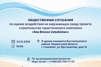 23 января в 10:00 в здании хокимията Бостанлыкского района (Ташкентская область, г. Газалкент, ул. Мустакиллик, дом 14) состоятся общественные слушания по оценке воздействия на окружающую среду (ОВОС) строительства туристического комплекса «Sea Breeze Uzbekistan».