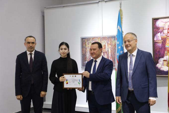 Сегодня румыно-узбекские отношения переживают яркий этап развития: растёт товарооборот, усиливается интерес румынского бизнеса к узбекскому рынку, а культурные проекты становятся узнаваемыми и востребованными среди широкой публики. Об этом, о том, как впечатляют работы представленные на выставке говорил в своем выступлении Посол Румынии в Узбекистане Даниэль Кристиан Чобану: Assalomu aleykum. Hurmetli hanimlar ve cenablar. Aziz dostlar. Mening ismim Daniel Cristian Ciobanu. Men Ruminiyaning O'zbekistandagi elcisiman. Hush kelibsiz. Уважаемые дамы и господа. Выражаю искреннюю благодарность руководству Академии художеств Узбекистана и ректору Национального Института Живописи и Дизайна им. Камолиддина Бехзода за участие в организации этой выставки. Это наш второй совместный проект. В феврале прошлого года мы организовали выставку, посвящённую румынскому скульптору Константину Брынкушь. Господин заместитель Председатель и господин ректор у Вас замечательная команда! Для меня - большая честь быть здесь с Вами. Открытие выставки – важное событие. Мероприятие посвящено 30-летию установления дипломатических отношений между Румынией и Узбекистаном ( 6 октября 1995 года). Развитие сотрудничество с Узбекистаном является одним из приоритетов Румынии в Центральной Азии. Отмечаю наши динамичные обмены во всех областях в последние годы. Приветствую очень хорошее политическое и экономическое взаимодействие. Прошлый год стал одним из лучших в истории наших торговых отношений. За последние 4 года товарооборот существенно вырос (рост более 316%). Узбекистан является очень ценным партнёром Румынии в Центральной Азии. Процесс реформ в Узбекистане открыл новые возможности для сотрудничества. Убежден, что наши отношения будут и дальше очень успешно развиваться. Я смотрю на будущее с большим оптимизмом. У нас много достижений в сфере культуры. Культура является мостом, способным наилучшим образом сблизить наши народы. Сегодняшняя выставка особая. Мы сегодня объявляем результаты творческого конкурса среди студентов Института. Эти студенты - прекрасные, а их преподаватели - отличные. Уверен, что выставка останется в памяти как яркое событие в нашем сотрудничестве. Она послужит импульсом для развития взаимодействия в культурной сфере. Желаю любителям и ценителям искусства приятных впечатлений от знакомства с работами студентов Института. Они просто замечательные. По окончании церемонии награждения приглашаю Вас на приём. Спасибо за внимание. Катта рахмат!