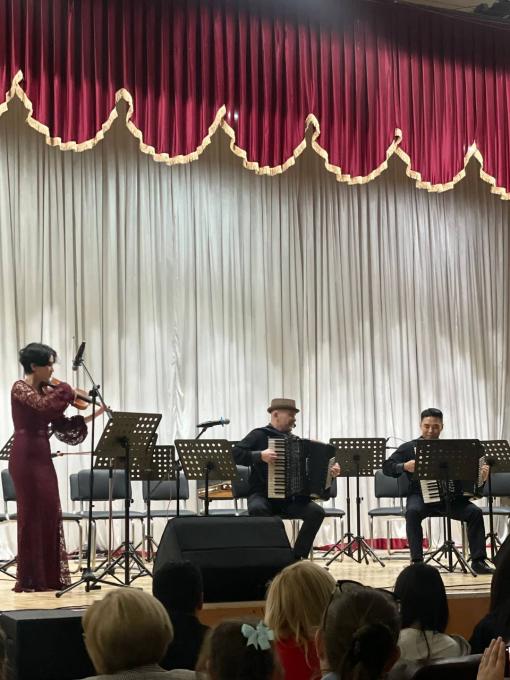 Благодаря Международному фестивалю Classical Music Fest мы услышали выступления блистательных исполнителей Сергея Крылова, Марка Бушкова и Максима Венгерова. И очень приятно было получить приглашение на концерт в специализированную школу им. Успенского. В этот раз скрипка звучала вместе с двумя аккордеонами. AccordionArt-мультикультурный музыкальный проект, создан в Южной Корее артистами Кореи , Узбекистана и России , объединенных любовью к музыке-так написано в аннотации к концерту.