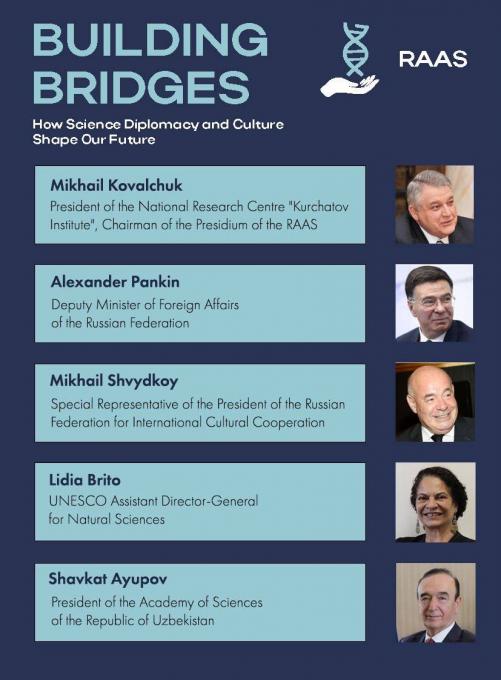В дискуссии примут участие лидеры международной науки и дипломатии, ключевые руководители профильных направлений ЮНЕСКО. Российская ассоциация содействия науке (РАСН) – общероссийская общественная организация, созданная в 2011 году по инициативе академика Е.П. Велихова. Слоган РАСН: «Поддерживаем науку, предвосхищая будущее». Среди ключевых задач Ассоциации – консолидация научного сообщества, популяризация науки, поддержка молодых исследователей. Одним из новых стратегических приоритетов РАСН является расширение международной деятельности и развитие научной дипломатии для укрепления сотрудничества с партнерами по всему миру.