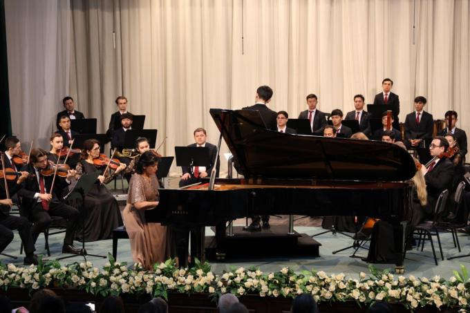 Зал был заполнен до последнего места. С первых минут чувствовалось особое ожидание — не только увидеть мастерство известной пианистки, но и прикоснуться к её внутреннему миру, услышать музыку так, как умеет раскрывать её именно она: деликатно, глубоко, искренне. Когда солистка вышла на сцену, в её походке, в её спокойствии и в благородной собранности сквозило то особое достоинство, которое невозможно сыграть или сымитировать — это осознанный результат многолетнего пути, сотен концертов, тысяч часов внутренней работы и удивительной верности искусству. Программа концерта была выстроена как живая линия развития фортепианного жанра, от строгой архитектуры эпохи барокко до свободного, масштабного дыхания романтизма. Но в этот вечер историческая логика стала лишь фоном: главным была сама интерпретация, то, как Сайёра Гафурова проживала каждое произведение. Казалось, она не играет музыку, она оживляет её, как будто дарит слушателям её заново. Начало вечера ознаменовал Концерт фа минор Иоганна Себастьяна Баха. В интерпретации Гафуровой был слышен не музейный академизм, а внутренний свет, мудрость и мягкое, почти материнское понимание музыки Баха. Она играла строго и при этом нежно; каждое движение кисти звучало как самостоятельный жест смысла. Звуки были прозрачными, но наполненными; строгость формы сочеталась с глубокой человечностью. В её прикосновениях к клавиатуре было что-то почти духовное, ненавязчивое, но ощутимое, словно она делилась с залом тем опытом, который накапливается десятилетиями общения с баховским наследием. Государственный симфонический оркестр (художественным руководителем и главным дирижером которого является, народный артист Республики Узбекистан, профессор Камолиддин Уринбаев) под управлением Аббосбека Вахобова вступал с Сайёрой Гафуровой как идеальный собеседник: ненавязчиво, бережно, но предельно точно. Вахобов, обладая тонким чувством меры, не позволял оркестру перекрыть солистку или доминировать, но и не растворял его полностью — создавая ту самую тонкую грань баланса, так редко встречающуюся в исполнениях баховских концертов.