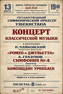Симфония чувств: П. И. Чайковский и А. К. Глазунов на ташкентской сцене![]() Музыка обладает удивительной силой — она способна переносить человека в разные миры, пробуждать глубокие чувства и заставлять по-новому переживать знакомые истории. Именно такую атмосферу можно было почувствовать на концерте Государственного симфонического оркестра Узбекистана, который состоялся 13 марта 2026 года в зале Дворца творчества молодёжи в Ташкенте. Этот вечер стал настоящим праздником симфонической музыки, объединившим слушателей в переживании красоты и силы музыкального искусства. За дирижёрским пультом в этот вечер стоял народный артист Узбекистана Камолиддин Уринбаев, чья интерпретация отличалась глубиной, выразительностью и вниманием к музыкальной драматургии. Концертную программу составили произведения двух выдающихся композиторов русской музыкальной культуры — Петра Ильича Чайковского и Александра Глазунова. Их сочинения, наполненные яркими образами, глубокими чувствами и богатством оркестровых красок, позволили слушателям погрузиться в разные художественные миры. Одним из центральных произведений концерта стала увертюра-фантазия «Ромео и Джульетта» Петра Ильича Чайковского. История создания этого произведения связана с именем композитора и дирижёра М. Балакирева. Именно он в 1869 году предложил Чайковскому обратиться к знаменитой трагедии Уильяма Шекспира. Композитора сразу заинтересовала эта идея, поскольку история трагической любви Ромео и Джульетты была ему особенно близка. Работа над произведением проходила в несколько этапов. Первая версия увертюры была написана в том же 1869 году и вскоре исполнена в Москве под управлением Николая Рубинштейна. Однако по совету М. Балакирева П.И. Чайковский неоднократно возвращался к партитуре, внося изменения в форму и оркестровку произведения. Окончательная редакция увертюры была завершена лишь спустя несколько лет и именно она принесла сочинению широкую известность. Со временем «Ромео и Джульетта» стала одним из самых любимых и часто исполняемых произведений композитора. В своей увертюре-фантазии П.И. Чайковский не стремится буквально пересказывать сюжет трагедии Шекспира. Музыка передаёт прежде всего её основную идею — столкновение любви и непримиримой вражды. Произведение открывается медленным вступлением. Суровое и несколько холодное звучание низких деревянных духовых инструментов создаёт атмосферу напряжённости и предчувствия трагических событий. Постепенно музыка оживляется, и возникает стремительная тема, символизирующая вражду между родами Монтекки и Капулетти. Резкие акценты оркестра, стремительные движения струнных и яркие оркестровые вспышки передают образ ожесточённого столкновения. Исполнение этой увертюры на концерте произвело сильное эмоциональное впечатление на слушателей. Оркестр сумел ярко передать контраст между драматизмом борьбы и трогательной лирикой темы любви, благодаря чему музыка воспринималась особенно выразительно и проникновенно. Особую роль в исполнении увертюры сыграла интерпретация дирижёра. Маэстро сумел тонко выстроить драматургию произведения, постепенно раскрывая его эмоциональное напряжение. Особенно ярко это ощущалось в звучании темы любви Ромео и Джульетты. В этот момент музыка приобрела особую мягкость и г