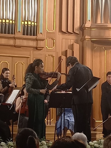 Фортепианная линия, представленная доцентом кафедры специального фортепиано Государственной консерватории Узбекистана, лауреатом международных и республиканских конкурсов Рахметом Палвановым, выполняла в этом концерте не столько сопровождающую, сколько объединяющую функцию. Его партия становилась тем невидимым пространством, в котором встречались разные исполнительские индивидуальности, выстраивая общее звуковое поле. Звучание ансамбля во многом определялось и внутренней организованностью оркестра, где важную роль играли его концертмейстеры: Камилла Ходжаева (скрипка) – концертмейстер оркестра, Сирожиддин Сайфиддинов – концертмейстер группы вторых скрипок, а также Дурдона Садыкжонова (альт) и Зарина Джаббарова (виолончель). Именно эта внутренняя собранность, умение выстраивать взаимодействие не только по вертикали, но и по горизонтали ансамбля, формировала то особое качество звучания, в котором ощущалась не сумма партий, а единое художественное пространство. В этом контексте особенно ясно проявлялось главное содержание вечера: не отдельные произведения и не индивидуальные выступления, а само состояние ансамбля – как формы мышления. Здесь не возникало противопоставления «опыта» и «становления»: студенты и их наставники существовали в едином процессе, где передача традиции происходила не в слове, а в звучании, в совместном дыхании, в умении слышать и быть услышанным. Именно поэтому этот концерт воспринимался как нечто большее, чем просто выступление. Это было живое проявление школы – не как институции, а как непрерывной линии, в которой сохраняется и развивается музыкальная культура. Атмосфера зала, внимание публики и особое ощущение внутреннего единства сделали этот вечер подлинным свидетельством того, что традиция в музыке существует только тогда, когда она звучит – здесь и сейчас, от одного поколения к другому. Мафтуна Багирова, студентка Государственной консерватории Узбекистана