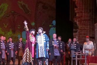 Очень хороша была и его дочь Марфа, которую пела Лятифе Абиева. Отлично смотрелись в спектакле и Любаша/ Анастасия Юдина/, и Домна Сабурова/ Надежда Банделет- Голендер/. Это же можно сказать и об остальных участниках спектакля. Порадовали зрителей массовые сцены, яркие костюмы, отличное оформление и антураж самой сцены. Проекции качающихся колоколов были замечательны и прекрасно соответствовали сюжетной линии. Хорошо поставлены мизансцены, вся площадь сцены активно использовалась в этом спектакле. Сам царь Иван Грозный, в исполнении А Слонима, появляется на сцене лишь на миг. Безмолвный! Но его злая воля доминирует над всеми героями. Здесь он олицетворение злой, губительной силы.