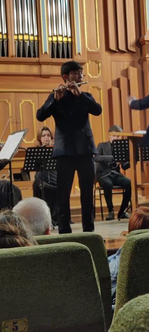 Открывала концерт Эльмира Миркасымова – выдающаяся узбекская пианистка, доцент консерватории Узбекистана, выступление которой украшает любой концерт. На этот раз она исполнила клавирный концерт И.С.Баха №3 Ре мажор. Вероятно, что участникам концерта, играющим после неё, было нелегко. Исполнительская планка была невероятно высока. Как обычно эта опытная и талантливая пианистка продемонстрировала чувство стиля и формы, техническое совершенство. Все образные «повороты» и «переключения» от героического пафоса до проникновенной лирики и галантного изящества были продемонстрированы в полной мере. Музыка барокко звучала без преувеличений и вычурности, однако с характерной строгостью и изысканностью. За роялем присутствовал настоящий мастер. Порадовало и взаимодействие с оркестром, который «включился» в диалог, не нарушая звукового и стилевого баланса. Яркое впечатление оставило и выступление кларнетиста Асилбека Юлдашева, исполнившего сложнейший концерт К.М.Вебера (переложение квинтета) в четырёх частях. Этот солист продемонстрировал настоящий виртуозный стиль Вебера, что не всегда удается столь молодым исполнителям. И дело не только в виртуозных и сложных штрихах и пассажах. Прекрасная фразировка, музыкальность, обилие звуковых нюансов, логика выстроенных образов – это арсенал опыта и мастерства. Хочется отметить и естественность, органичность исполнения. Всё было сыгранно без каких-либо надрывов и усилий. Кажущаяся простота исполнения такого сложного произведения – безусловное свидетельство высокого исполнительского уровня. Оригинальным было выступление Батыра Досимбетова, исполнившего на народном инструменте нае знаменитую композицию Джеймса Ласта «Одинокий пастух». Звучание ная удивительно напоминало о флейте Пана, для которого написан оригинал произведения. Красивая романтическая композиция украсила концерт, погрузив слушателей в далекие ностальгические воспоминания 80-х годов. Выступление студентки I курса консерватории Каролины Бахтеевой было неожиданным. Можно похвалить солистку за смелость. «Цыганка» М.Равеля – одно из самых сложных произведений мирового скрипичного репертуара. Вероятно, что через какое-то время юной скрипачке удастся справится с техникой, звуком и интонацией, а главное – сложнейшей стилевой задачей этого произведения, которая выходит за рамки простого подражания цыганскому пению. Нужно отдать должное оркестру, который оказал неоценимую помощь солистке во втором разделе произведения, взяв на себя всю выразительность и эмоциональную составляющую часть этого непростого произведения. Отдельно хочется сказать об инструментальных миниатюрах, прозвучавших на концерте. Произведение современного туркменского композитора Р.Непесова «Художник» показалось весьма интересным. Название отчасти отражало элементы композиции. Разделы, словно мазки кисти, яркие и отчетливые, сменяли друг друга, образуя своеобразную «палитру эмоций». Здесь было всё – проникновенная песенность, драматизм, национальный колорит. В целом произведение казалось декоративным оформлением какой-то картины, либо фильма. Доступность и простота музыкального языка вероятно сделает эту музыку популярной и исполняемой. Несколько иное впечатление произвела миниатюра И.Пинхасова «Уфор». Здесь яркий национа