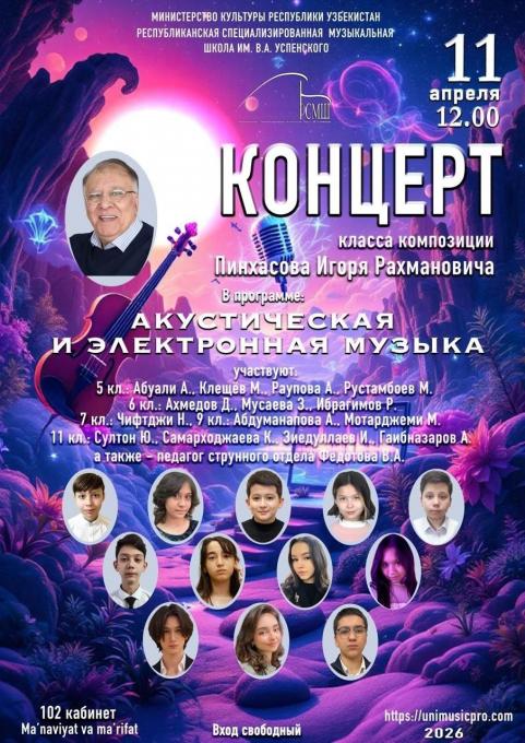 КАК РОЖДАЕТСЯ МУЗЫКА. В РСМШ им. Успенского состоялся концерт класса композиции Пинхасова Игоря Рахмановича![]() Мы все учились в школе. А значит, помним, что предмет музыка был у нас 1 по 7 классы. То есть более двухсот уроков! Что мы знаем в итоге? Что нам говорят слова симфония, оратория? Сможете ли вы рассказать, чем фуга отличается от прелюдии? Пушкин упрекает Онегина в невежестве: Не мог он ямба от хорея, Как мы ни бились, отличить.Как будто стихотворные ритмы обязаны знать все! А законы музыкальной гармонии? Признаемся, что слушателю не важно амфибрахий или анапест использовал поэт, в какой тональности до диез миноре или в ля мажоре написана ария. Чтобы стать искусством, кроме безупречности формы, произведение должно обладать магией воздействия – свойство, которое невозможно описать словами. - Вот этому невозможному мы и учим, - говорит Игорь Рахманович Пинхасов, - в Музыкальной школе им. Успенского уроки композиции вводятся факультативно с пятого класса. Занимаемся индивидуально. Сохраняем традиции, заложенные еще в 50-х основателями этого курса Борисом Надеждиным и Борисом Зейдманом. Да, вы правы, главное, развиваем фантазию, вдумчивость, умение слышать и слушать, различать мелочи, обобщать. Уроки композиции – это ещё и разговор о философии, искусствоведении и многом другом. Не раз уже говорил, музыка – это язык. А что ты хочешь рассказать – наваждение ужаса сновидений или тихое удивление распустившегося цветка – в этом твоя индивидуальность, то, что может покорить слушателя. Мы, слушатели, были покорены с первых звуков. Пятиклассники Рустамбоев Мухаммаджон, Раупова Амелия исполнили понятное, доступное воображению: «Весенний вальс», «Озорник», «Волшебная пещера», «Крылатый конь». Абуали Адам, Клещёв Марк с детской непосредственной уверенностью в успехе назвали свои композиции «Sadness» (грусть) и «Octagon» (восьмиугольник). - Но на всякий случай у нас есть в жизни план В, С и даже D, - Адам совершенно нормальный неугомонный пятиклассник, но рассуждает по-взрослому, - я еще увлекаюсь дизайном, IT. Мне представилось, что эти мальчики и девочки напишут оперу, сами создадут декорации, а духи Хо́гвартса «запоют» электронными голосами. Но мой внутренний голос совершенно зря подтрунивал над ребятами. Потому что дальше мы действительно услышали «Юрагимда Сен» Абдуманаповой Адели (9кл). Всё авторство Адели: стихи, вокал, электронная композиция. Её «Синий шёпот» (почему шёпот синий? Поистине, музыка начинается там, где заканчиваются слова) для голоса скрипки и фортепьяно прозвучал настоящим концертным ансамблем.