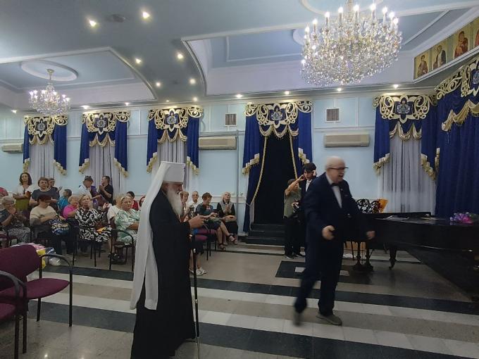 Три чудесных музыкальных приношения были от Анжилики Мухаметзяновой. Это романсы П. И. Чайковского на стихи с тихой грустью А. К. Толстого «Горними тихими летела душа небесами…», на стихи Н. Грекова «Погоди…» …Только слышно, как шепчут берёзы А также С. В. Рахманинова на стихи А. С. Пушкина «Не пой, красавица, при мне…». Дильбар Салихджанова порадовала романсами П. И. Чайковского на стихи А. Апухтина «Забудь так скоро…» и на стихи А. Плещеева «Колыбельная песнь в бурю». Из века в век молятся матери за своих детей, за то, чтобы миновали бури, прошли стороной и не случались в их жизни: …Спи, дитя, спокойно... Галина Голубкова, поражая слушателей чувственностью и глубиной своего голоса, исполнила два романса П. И. Чайковского. Один из них был на стихи А. Плещеева «О, спой ту же песню, родная…» и раскрывал тему неразрывной связи с главным, что составляет существо человека – родственностью близких душ, основа которой – Божественная и человеческая сила. А второй – на стихи А. К. Толстого «То было раннею весной…». Галина Голубкова поделилась и осенним настроением: …Проходит снова осень по земле, Кружатся листья, как воспоминанья. Как искры в остывающей золе, Мерцают звёзды…вечно их мерцанье…. Это строчки из ещё одного романса на стихи А. Дементьева музыка – П. Ермишева. Да, сентябрь последними своими днями погружает нас в осень ещё глубже. Молодая солистка Мария Сотникова поведала слушателям полную отчаяния и надежды историю любви, достигшую трагических высот в романсе П. И. Чайковского на стихи А. К. Толстого «Кабы знала я, кабы ведала…». И снова звучала музыка П. И. Чайковского, уже в романсе на стихи А. Фета «Певице» («Уноси моё сердце…»), написанные в 1857 году: …Уноси ж мое сердце в звенящую даль, Где кротка, как улыбка, печаль, И всё выше помчусь серебристым путём Я, как шаткая тень за крылом. Преподали духовные уроки и поведали житейскую мудрость зрителям стихотворения-притчи Андрея Евсеевича Слонима. Это «В смятеньях мир, и страсти в нём бушуют…», «В тот очень давний день…», «Неожиданная встреча», «Не только о нотах…», а также стихотворение «По тропе своей жизни ступая…». По окончании концертной программы митрополит Викентий сказал: –Во всех моих трудах были и есть люди, которые помогают мне в этом деле. Вот среди помогающих мне нести своё архипастырское служение это и вы, поддерживающие меня во всём, приносящие радость, утешение, чувство благодарности Богу и людям. Я очень рад, что были исполнены такие песнопения и прозвучали стихи, которые являются проповедью добра, мира, веры в Бога, благочестия. Эти встречи очень важны и благотворно влияют на наших слушателей. Всех вас благодарю за эту поддержку, радость общения, дружбу и уважение, тёплые отношения. Отрадно, что мы все вместе составляем семью нашего Отечества. Живём здесь в мире и согласии, любви друг к другу. А дальше были слова благодарности и цветы от зрителей, клуба «Наше родословие». В заключение Андрей Евсеевич Слоним сказал: –Наш вечер прошёл на тёплом, удивительно человеческом начале. Это свидетельствует о том, что наши связи с владыкой, действительно, крепки и через него своеобразным, чудесным мостиком мы связаны с ещё не полностью понятым великим Вышним миром Творца и его законов. Всем здравия и много-много счастливых лет! Концерт закончился. Но зрители не торопились расстава