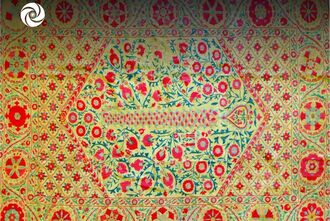 Коллекция текстиля Узбекистана состоит из трех предметов. Это две вышивки сузани и один экземпляр комплекта верхней одежды.
