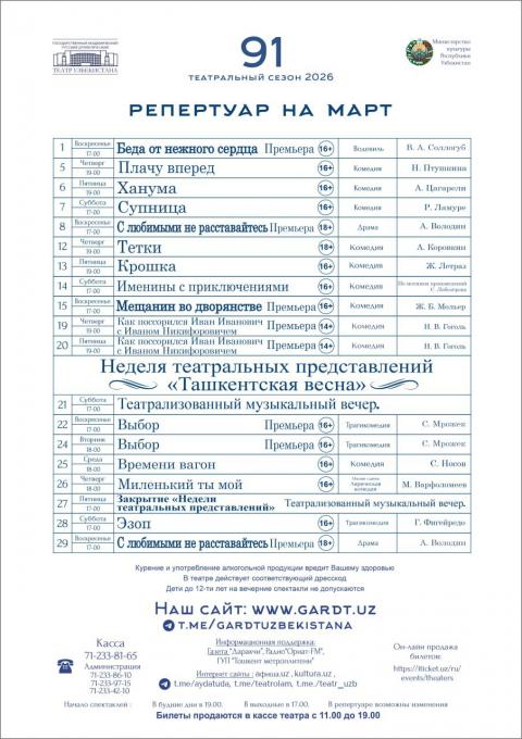 Март открывает театральную весну — месяц премьер, ярких встреч и живых эмоций. В репертуаре — классика, музыкальные комедии, современные постановки и особая «Неделя театральных представлений», посвящённая искусству сцены и её мастерам.