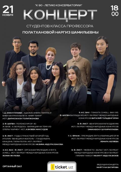 Музыкальное путешествие: восемь историй одного вечера![]() Концерт студентов класса профессора Полатхановой Наргиз Шамильевны К 90-летию Государственной консерватории Узбекистана 21 ноября, 18:00 | Органный зал 21 ноября Органный зал Государственной консерватории Узбекистана приглашает вас на особенный вечер — концерт, где восемь талантливых исполнителей расскажут свои истории языком музыки. Каждое произведение — это дыхание жизни. В нём пульсирует воля творца, звучит сила преодоления, горит огонь страсти, живёт светлая тоска и царит вечная надежда. Восемь молодых музыкантов на сцене воплотят всё то, что вечно в человеческой душе. Дилнозахон Толипжонова откроет вечер «Адажио Амира Темура и Биби ханум» Д. Амануллаевы — музыка, где узбекская историческая память обретает дыхание, слышна не просто мелодия, а голос эпохи. Азизбек Максудов воплотит героический дух Шопена в Полонезе №1 ор.40 — произведении, которое называют «военным маршем польской гордости». Это не просто танец, но манифест непокорённого духа. Вариации Володося на тему «Кармен» Бизе добавят огонь страсти и виртуозный блеск — здесь техническая сложность служит выражению драмы, где любовь и судьба сталкиваются в смертельном танце. Назима Абдуразакова перенесёт слушателей в романтическую Италию через «Годы странствий» Листа. Композитор писал эти пьесы как музыкальный дневник паломника — путешествие сквозь красоту и тоску, где венецианские воды отражают внутренние бури души. Ясмин Якубова исполнит монументальную Органную прелюдию и фугу a-moll Баха в транскрипции Листа. Когда она играет Баха, кажется, будто Органный зал превращается в храм. Лист, великий почитатель Баха, создал эту транскрипцию с глубочайшим уважением к оригиналу, превратив органное полнозвучие в фортепианную архитектуру. Виталий Гольденгорин, несмотря на отсутствие музыкального образования, будучи студентом Университета им. Михаила Ломоносова факультета Прикладной математики и информатики, обладает редким природным чутьём к музыке. Виталий представит контраст эпох: виртуозную Токкату ре минор И.С. Баха, где исполнение раскрывает техническое мастерство и яркую выразительность, а также романтическую Балладу №2 Ф. Шопена, полную тонкой чувственности и лиризма. Оминабону Шукуриллаева воплотит венгерский темперамент в Рапсодии №6 Листа. Это произведение следует традиционной форме lassan-friska — от торжественного вступления через страстную медитацию к головокружительному финалу. Венгерская рапсодия №6 — это испытание для пианиста «мелодия, требующая сверхчеловеческой выносливости в октавах». Лемара Абляева исполнит одну из жемчужин классического репертуара — Прелюдию, фугу и вариацию ор. 18 Сезара Франка. Произведение, посвящённое Камилю Сен-Сансу, пронизано «нежной меланхолией». Обладающая редким исполнительским даром, Лемара Абляева выразит то, что осталось невысказанным в душах многих. Слова любви, прощания, благодарности, что каждый из нас хотел бы произнести, но не успел. Махмут Абдулазизов, спустя три года молчания, воспламенит зал демоническим «Мефисто-вальсом» Листа — произведением, которое изображает сцену из «Фауста» Ленау: дьявол берёт скрипку и своей игрой доводит крестьян до исступления. Это музыка, где виртуозность сама становится дьявольской силой, где страсть граничит с